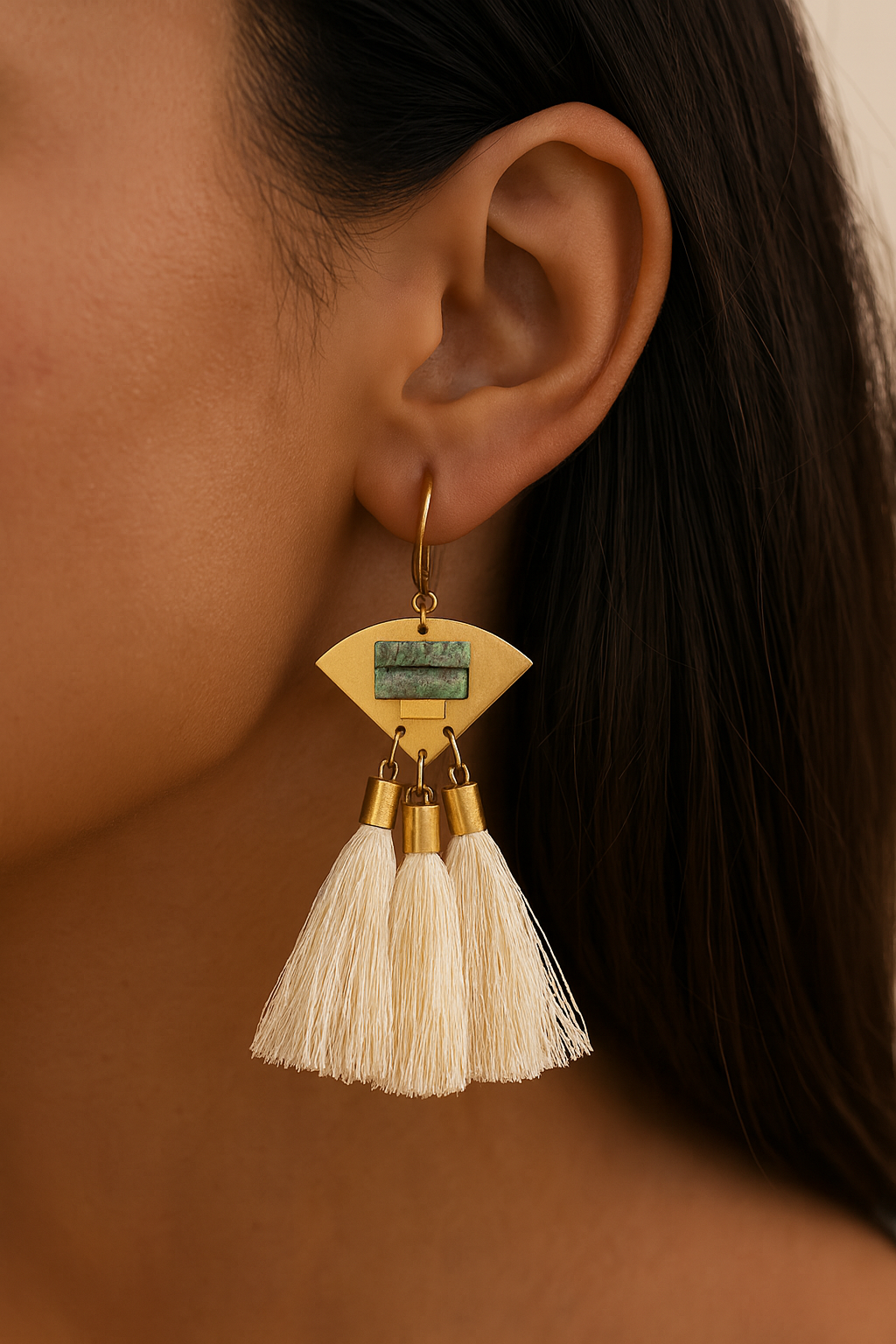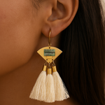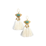 The Eau Claire Turquoise Earrings capture the essence of movement and color, where luminous turquoise stones meet cascading white silk tassels. Anchored in brass, this design blends organic vibrancy with fluid elegance, creating earrings that are equal parts playful and refined.