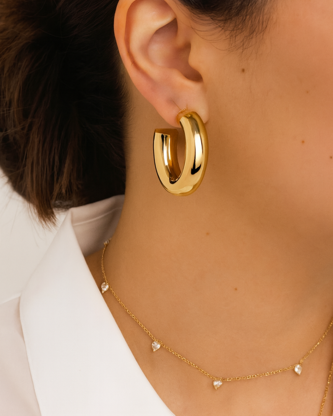 Sleek, bold, and lightweight make them perfect for everyday wear. These medium gold hoop earrings are your new daily go-to for adding polish to any look.