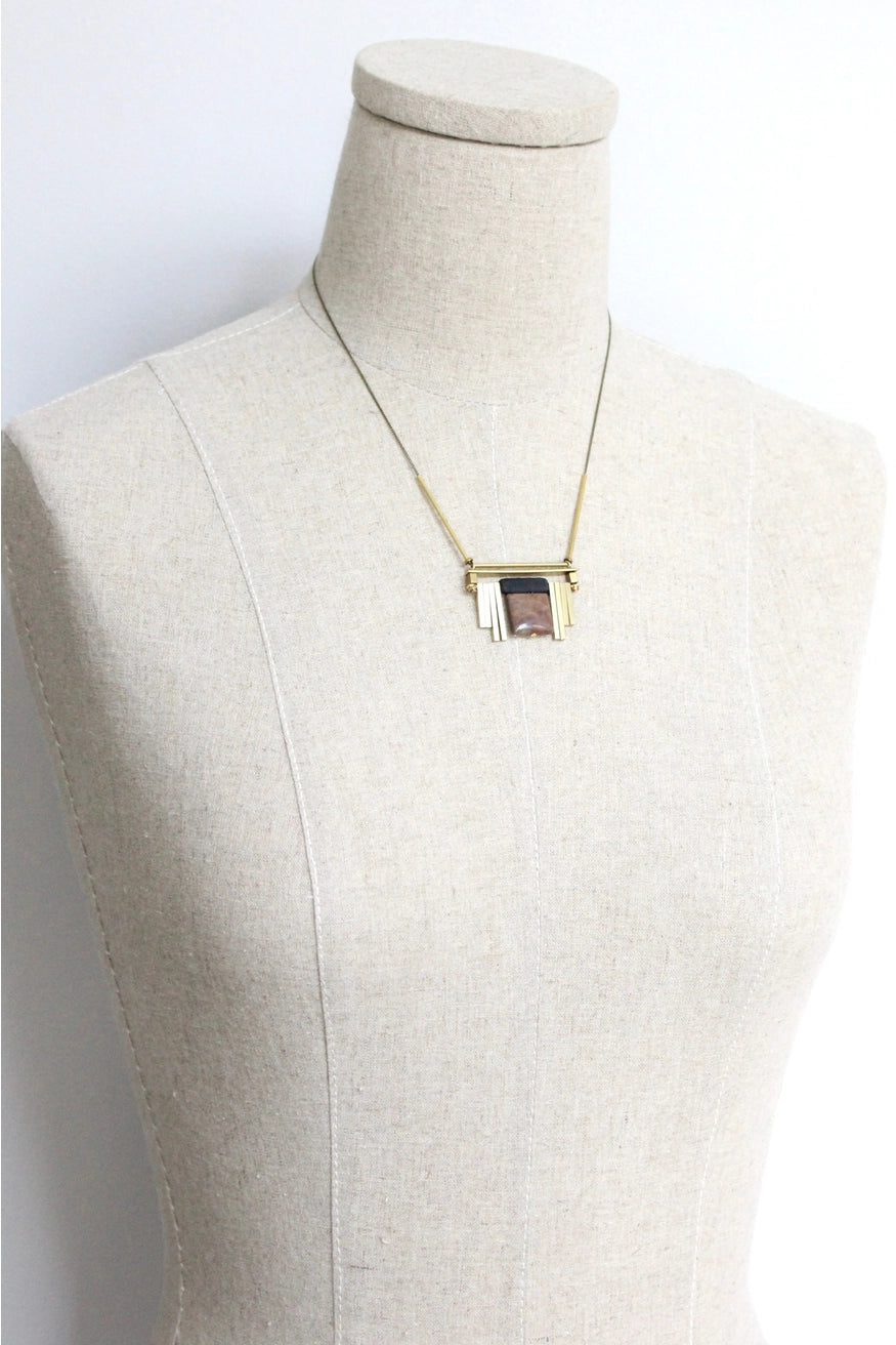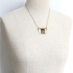 The Lenna Necklace is a modern interpretation of Art Deco glamour: striking, refined, and effortlessly versatile. The pendant pairs black glass with purple aventurine, creating a luminous contrast of depth and vibrancy.