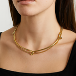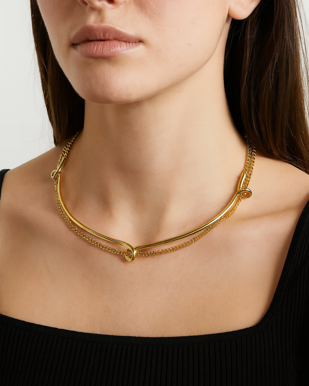 An modern take on the classic collar necklace with the chain detail and looped features. Perfect for a little edge.