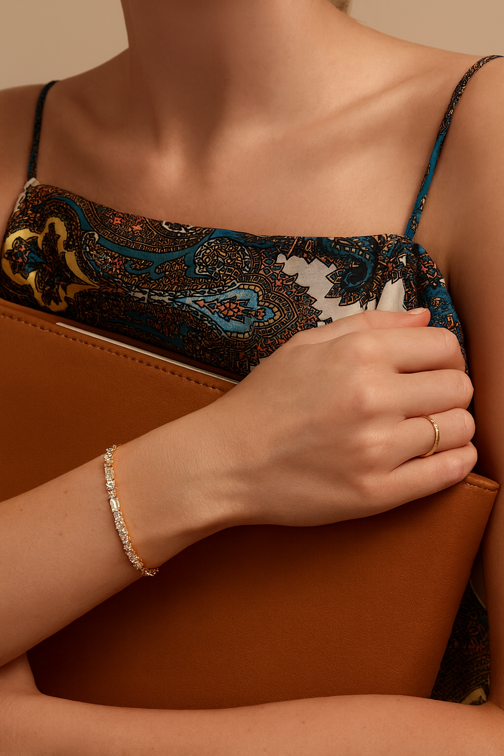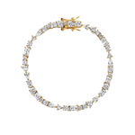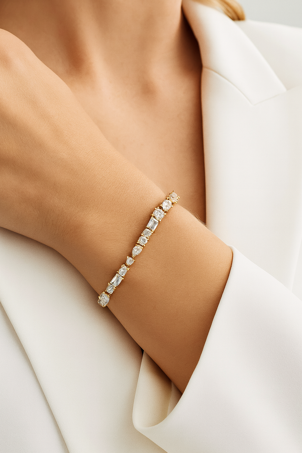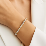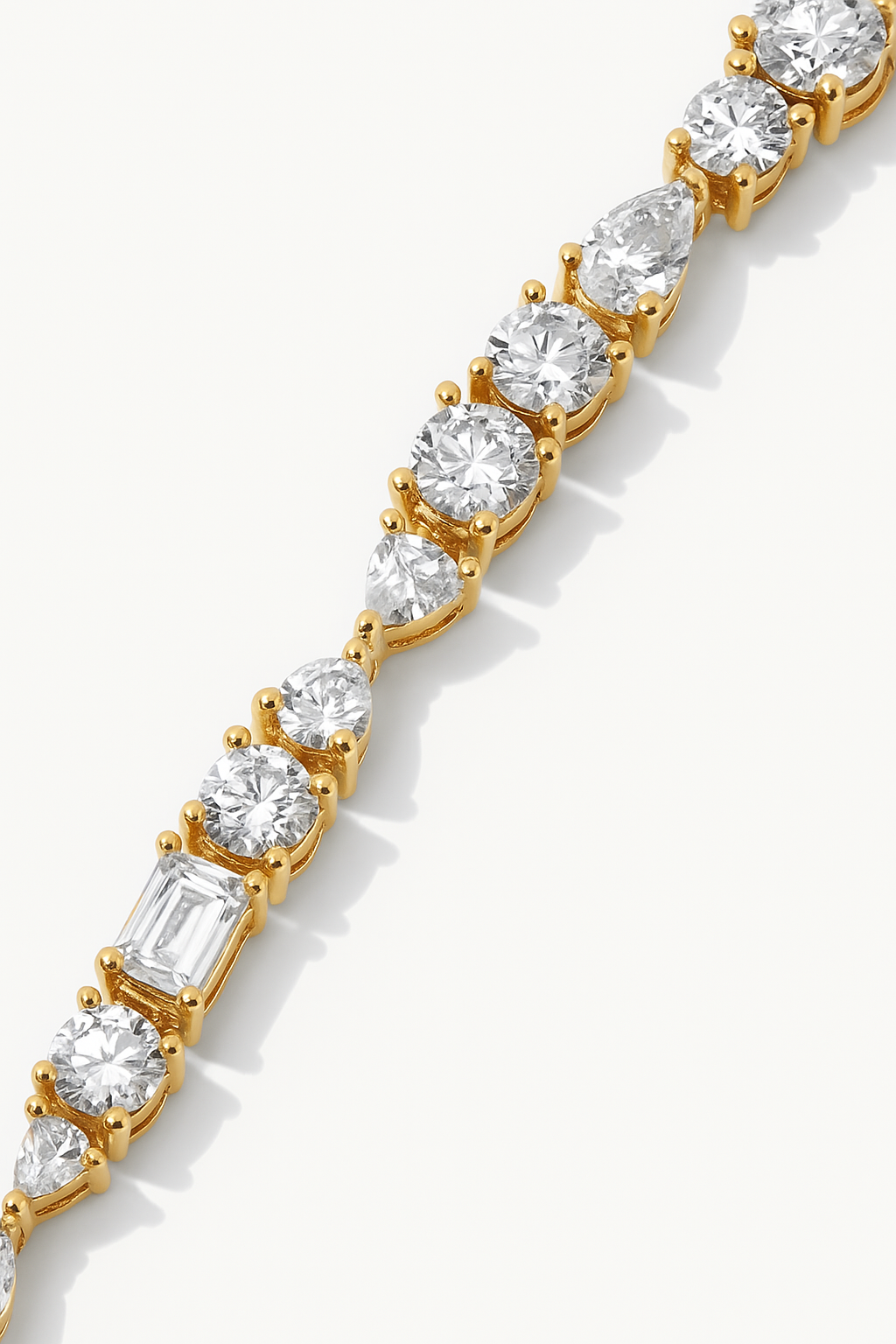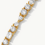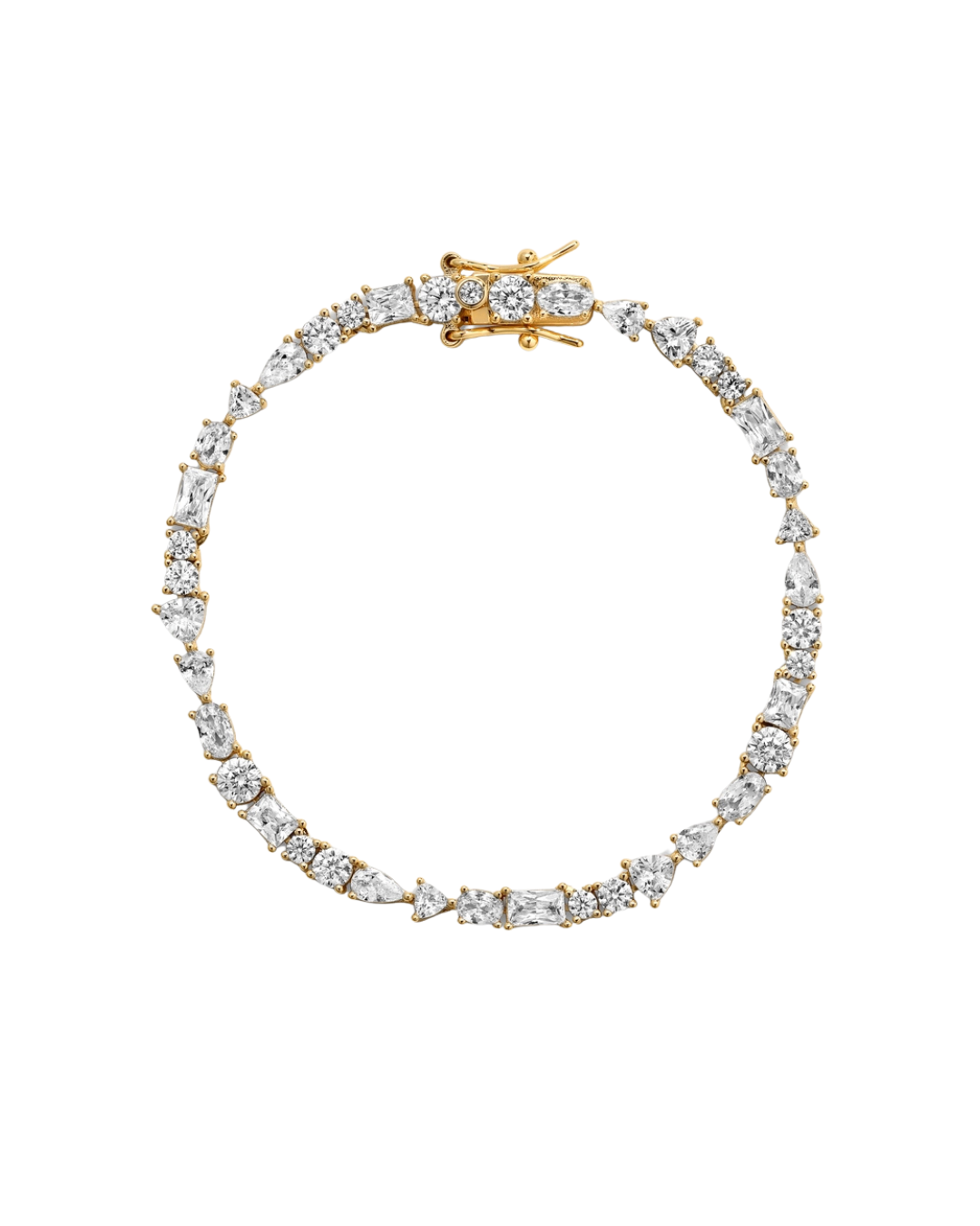 The Asymmetric Stone Tennis Bracelet is a quiet kind of brilliance. It’s delicate yet interesting, crafted with emerald cut, round, and pear shaped stones for a fresh geometric take on the classic diamond tennis bracelet style.