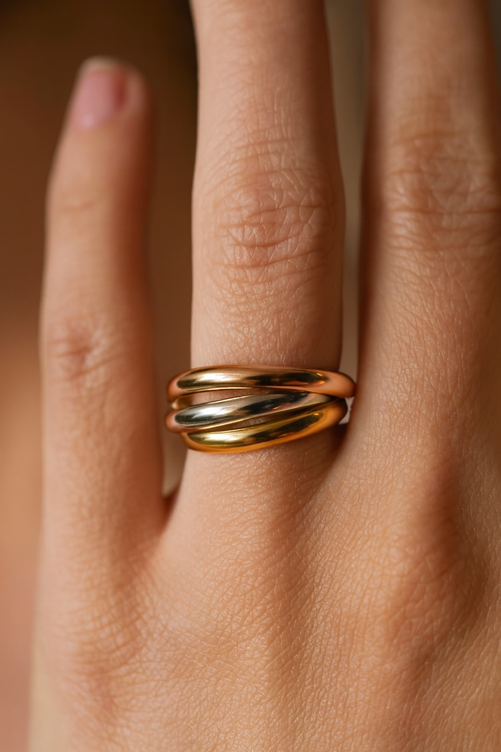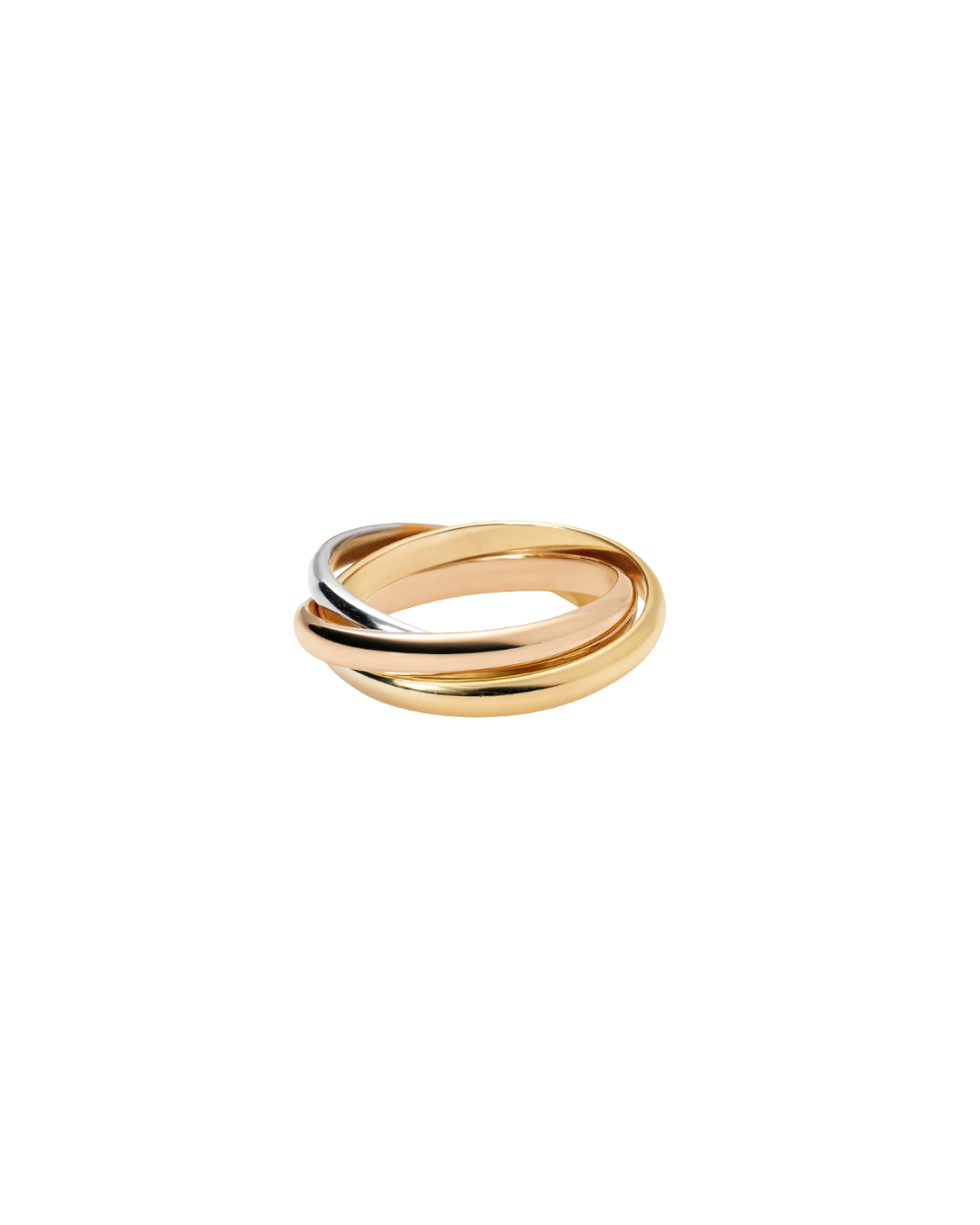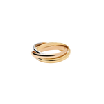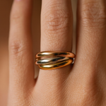 Make a bold statement with the Mixed Metal Interlocking Ring, a modern take on timeless elegance. This eye-catching piece features three interlocking bands, each in a distinct metal, one in silver, one in gold, and one in rose gold. Designed to move and roll effortlessly, these intertwined rings symbolize unity and flow, offering a dynamic feel that adjusts with your every motion.