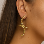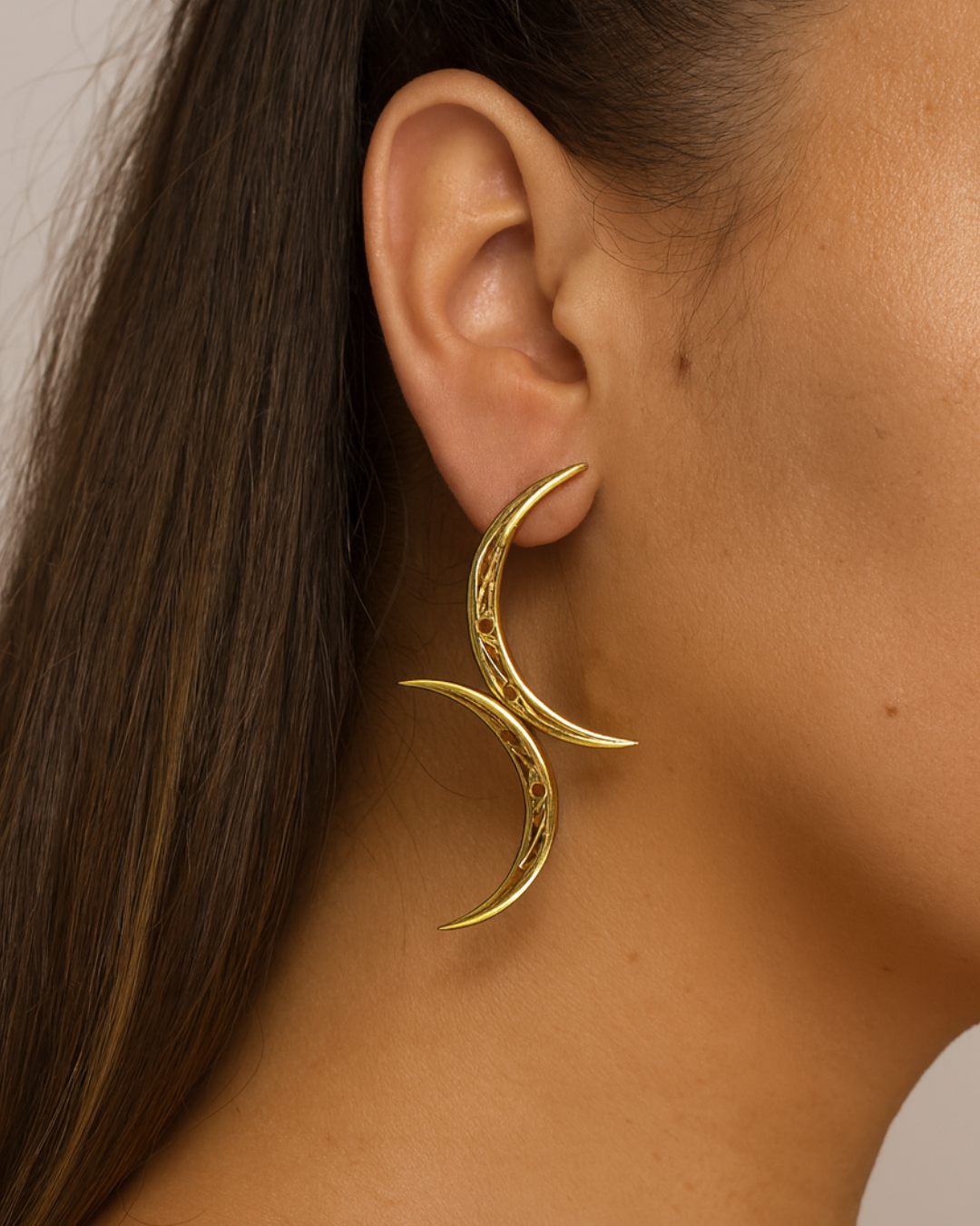 The Zuri Crescent Earrings strike the perfect balance between bold design and minimalist elegance. Handcrafted from recycled brass and finished in 22k gold, their sculptural curves and textured layers create a refined take on statement crescent earrings.